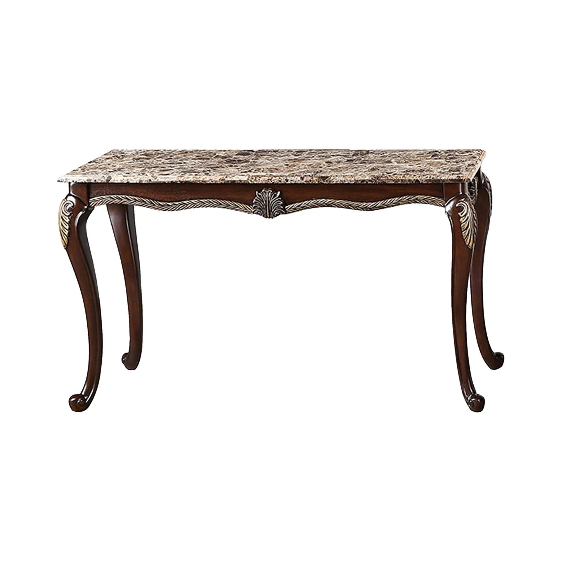 The Royal Classics Maximus Table is a perfect blend of heirloom craftsmanship and timeless design. Expertly crafted from solid pine with premium polyurethane carving details, this table offers both durability and long-lasting beauty. The lightweight yet robust carvings are resistant to moisture, rot, and cracking, ensuring their intricate detailing remains flawless over time with minimal maintenance. Finished with a meticulous multi-step process, the table enhances the natural beauty of the wood grain. The traditional Baroque-inspired design features ornate Rococo-style carvings that bring a sense of regal elegance to your home. Topped with a sophisticated marble surface, the rich blend of deep brown tones is accented by intricate white and beige veining, creating a luxurious, dynamic look. The swirling patterns and striking contrast between the dark hues and lighter streaks beautifully complement the ornate wooden base, making this table a perfect statement piece for any elegant living space.